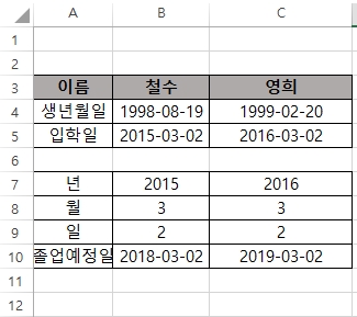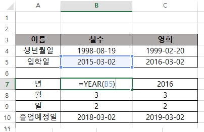 문제 : 위 참조표에서 철수의 입학 연도, 월, 일을 분리하고, 졸업(3년 후) 날짜를 계산하세요.