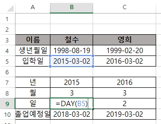 - 졸업(3년 후 날짜) : DATE(B7+3, B8, B9)